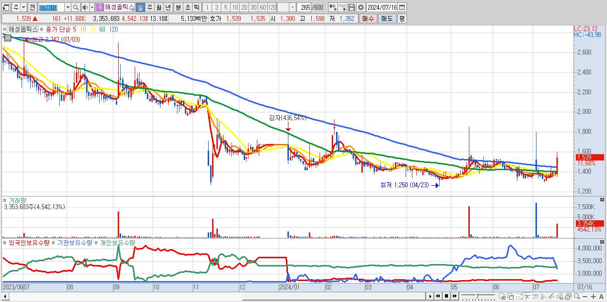 - 해성옵틱스 (1,539원 ▲ 11.68% , 시총: 392억, 거래량: 3,353,683, 거래대금:51억)