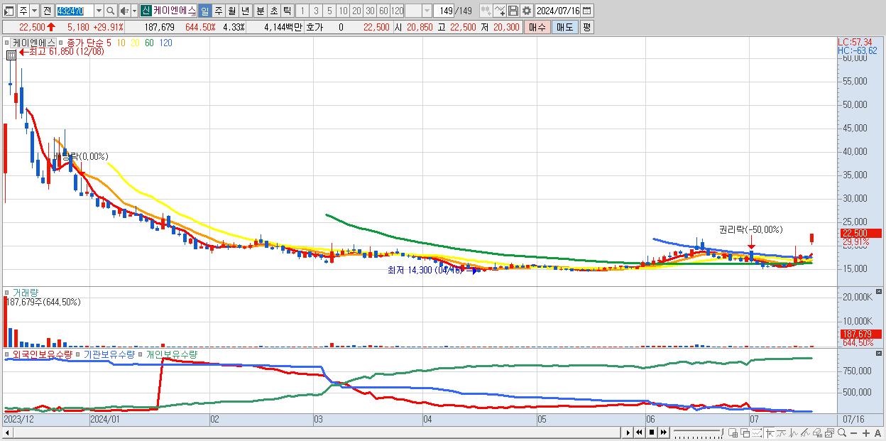 - 케이엔에스 (22,500원 ▲ 29.91% , 시총: 976억, 거래량: 187,679, 거래대금:41억)