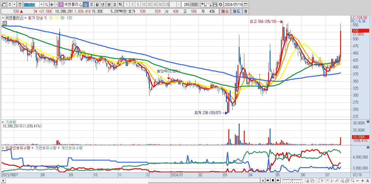 - 씨엔플러스 (530원 ▲ 21.56% , 시총: 360억, 거래량: 10,398,291, 거래대금:53억)