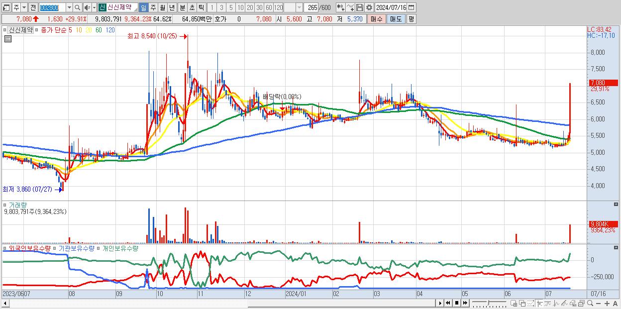 - 신신제약 (7,080원 ▲ 29.91% , 시총: 1,074억, 거래량: 9,803,791, 거래대금:648억)