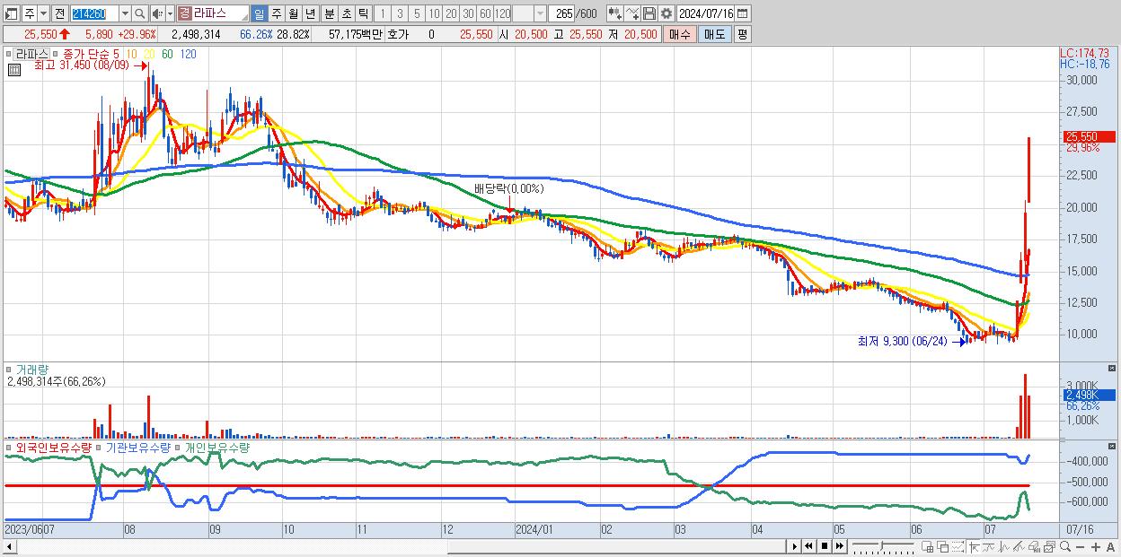- 라파스 (25,550원 ▲ 29.96% , 시총: 2,215억, 거래량: 2,498,314, 거래대금:572억)