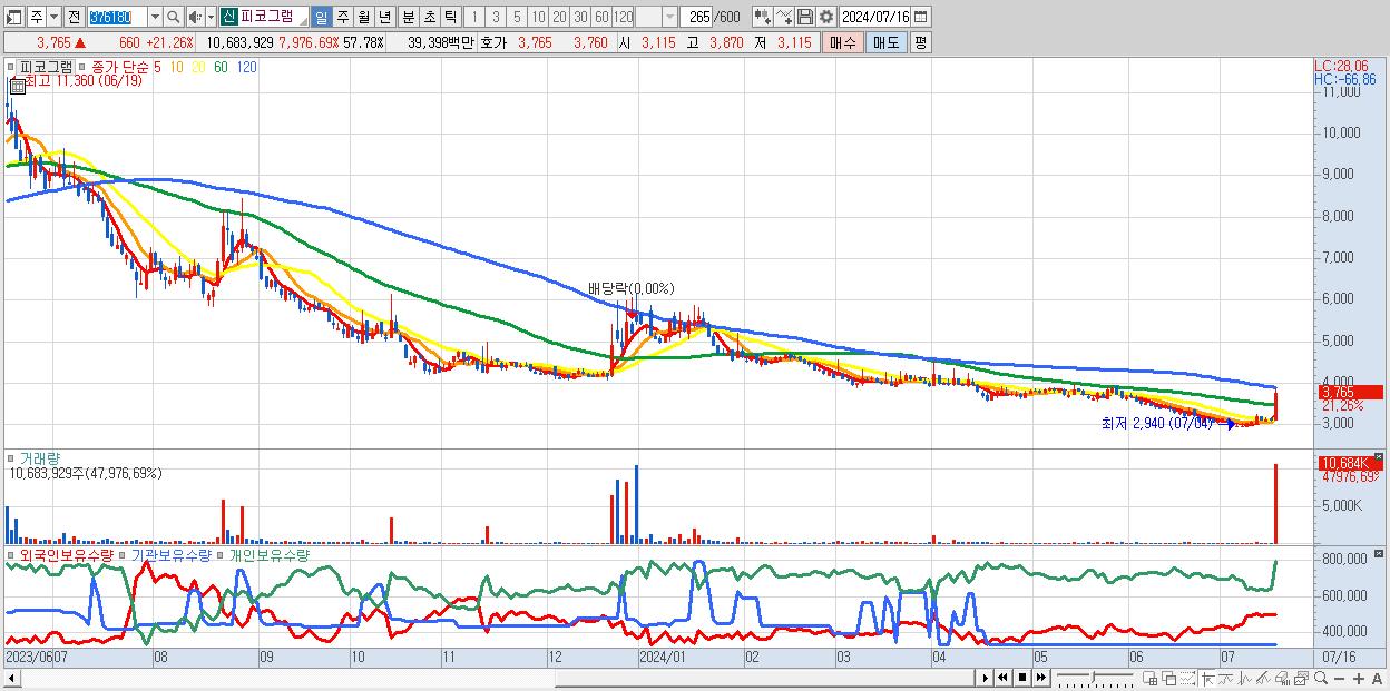 - 피코그램 (3,765원 ▲ 21.26% , 시총: 696억, 거래량: 10,683,929, 거래대금:394억)