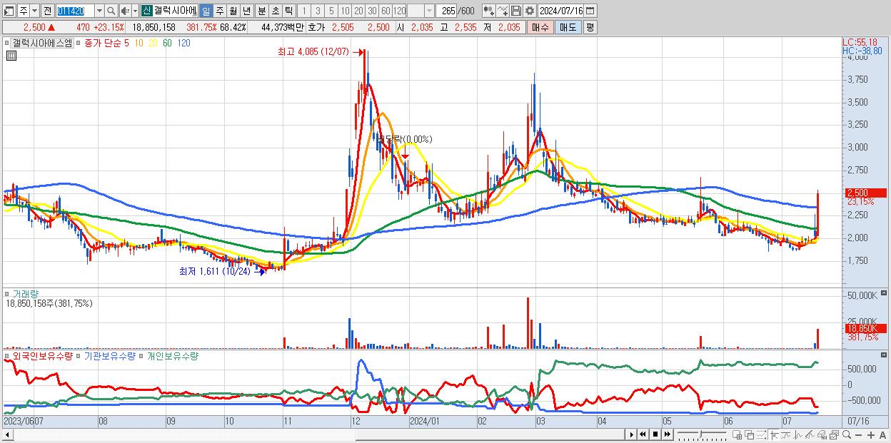 - 갤럭시아에스엠 (2,500원 ▲ 23.15% , 시총: 689억, 거래량: 18,850,158, 거래대금:444억)