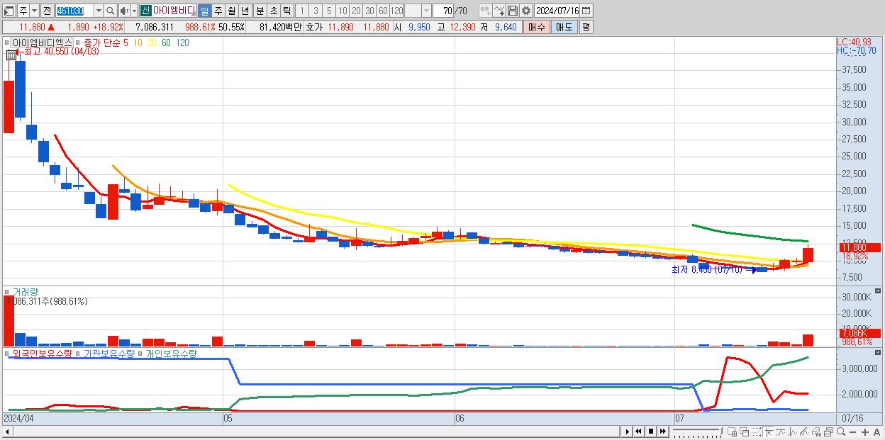 - 아이엠비디엑스 (11,880원 ▲ 18.92% , 시총: 1,665억, 거래량: 7,086,311, 거래대금:814억)