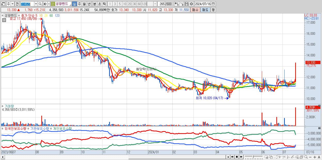 - 성광벤드 (13,330원 ▲ 15.21% , 시총: 3,812억, 거래량: 4,358,583, 거래대금:549억)