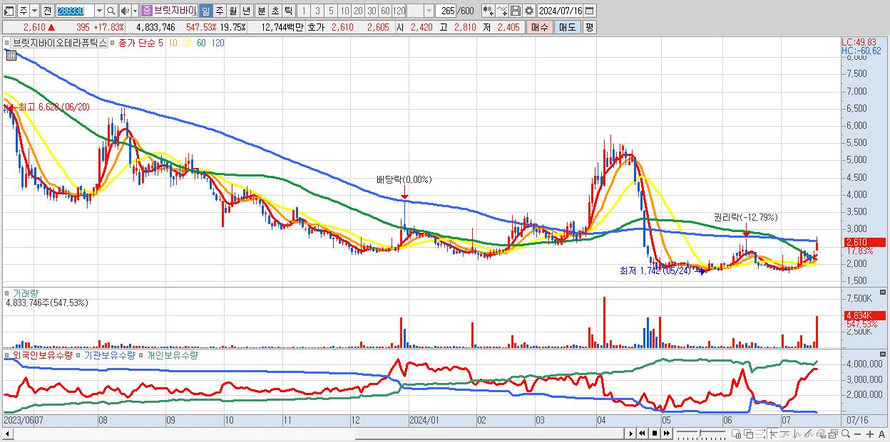 - 브릿지바이오테라퓨틱스 (2,610원 ▲ 17.83% , 시총: 639억, 거래량: 4,833,746, 거래대금:127억)