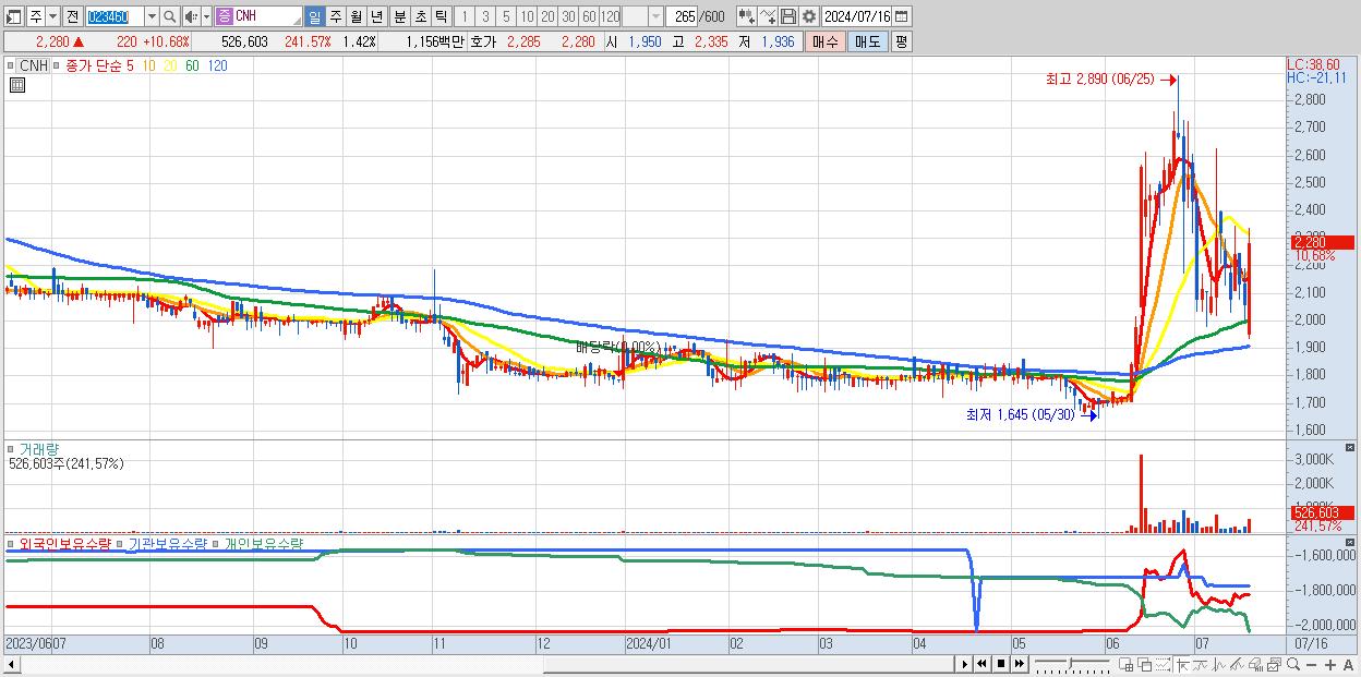 - CNH (2,280원 ▲ 10.68% , 시총: 848억, 거래량: 526,603, 거래대금:12억)