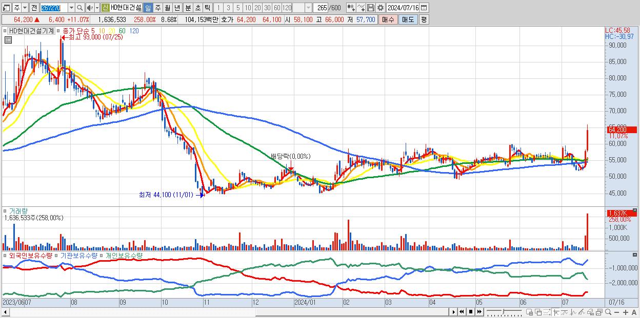 - HD현대건설기계 (64,200원 ▲ 11.07% , 시총: 12,100억, 거래량: 1,636,533, 거래대금:1,042억)