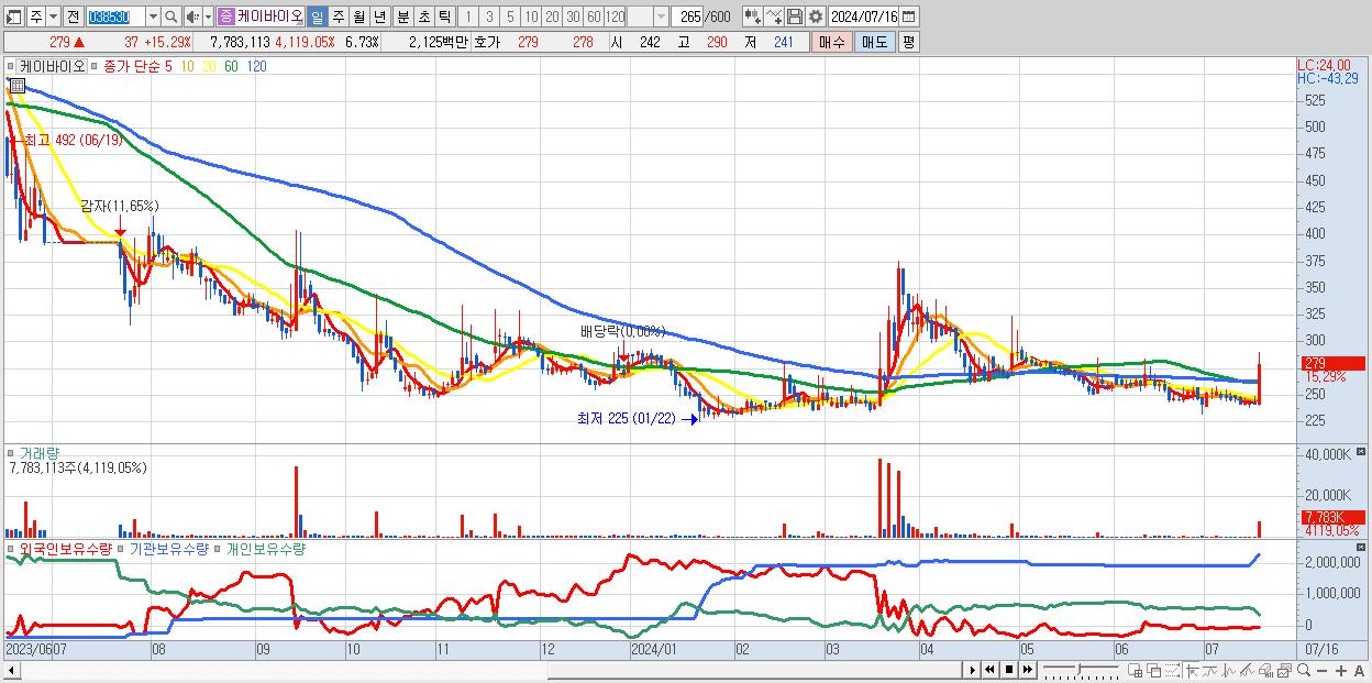 - 케이바이오 (279원 ▲ 15.29% , 시총: 323억, 거래량: 7,783,113, 거래대금:21억)