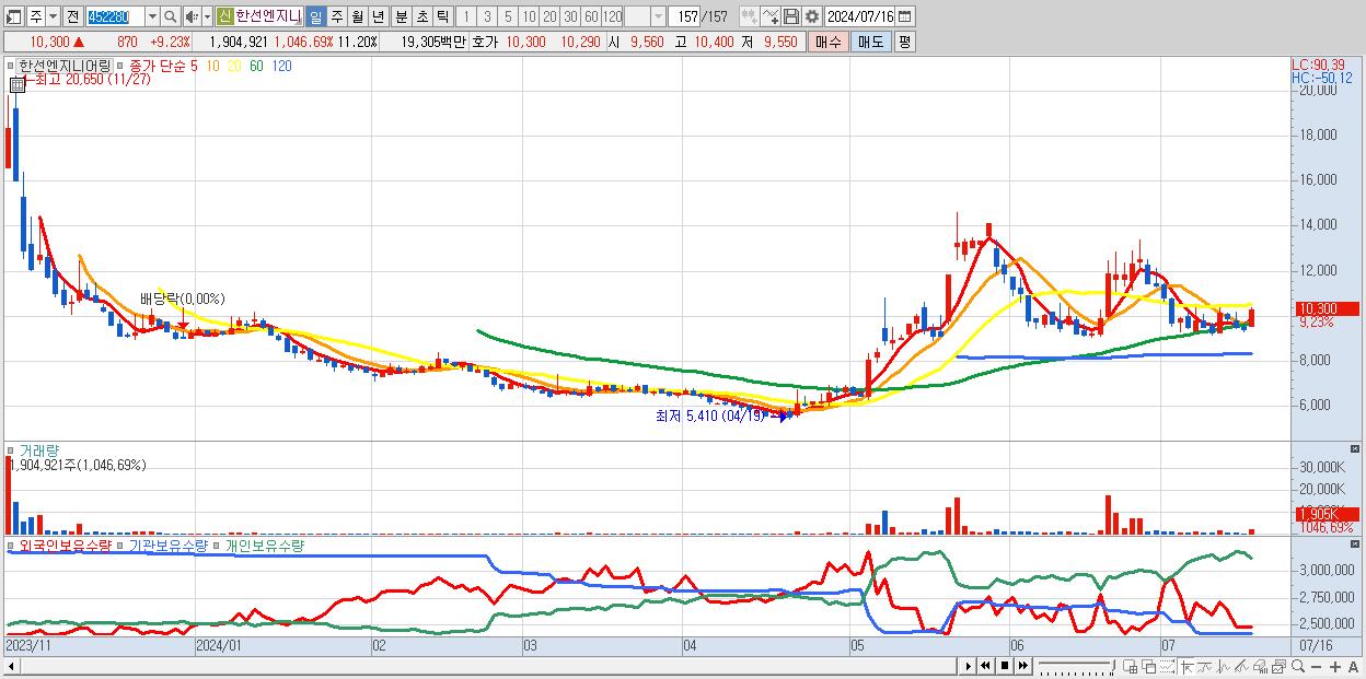 - 한선엔지니어링 (10,300원 ▲ 9.23% , 시총: 1,751억, 거래량: 1,904,921, 거래대금:193억)