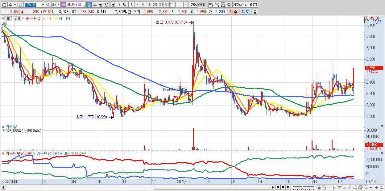 - 아이큐어 (2,650원 ▲ 17.52% , 시총: 995억, 거래량: 3,045,182, 거래대금:76억)