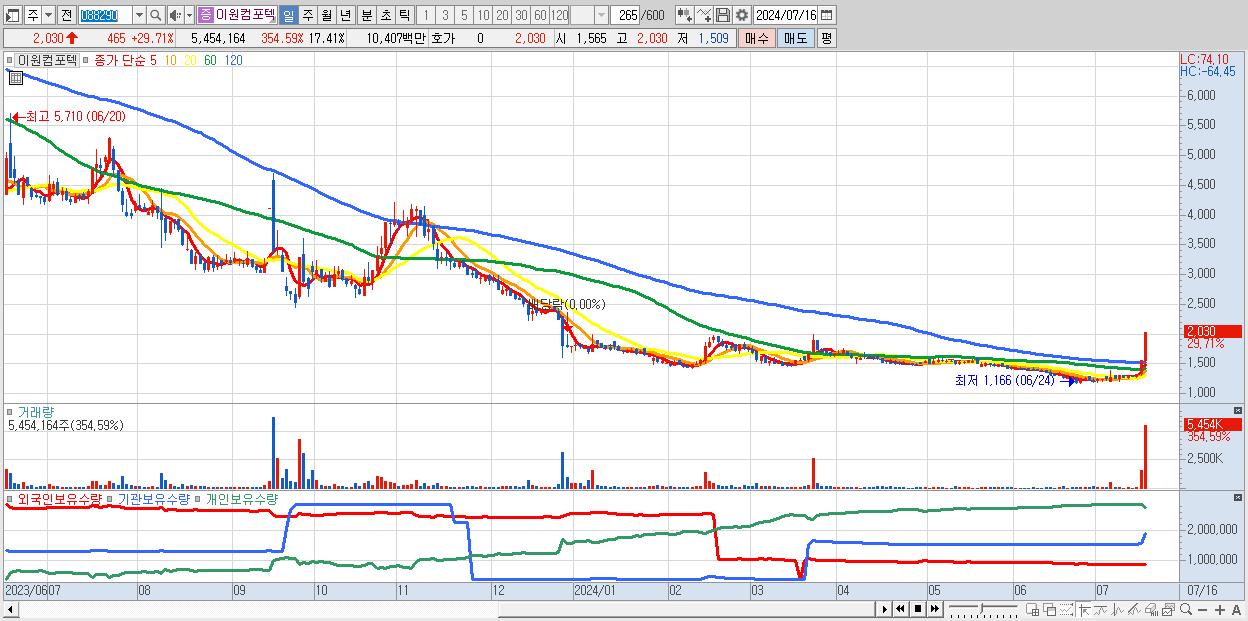 - 이원컴포텍 (2,030원 ▲ 29.71% , 시총: 636억, 거래량: 5,454,164, 거래대금:104억)