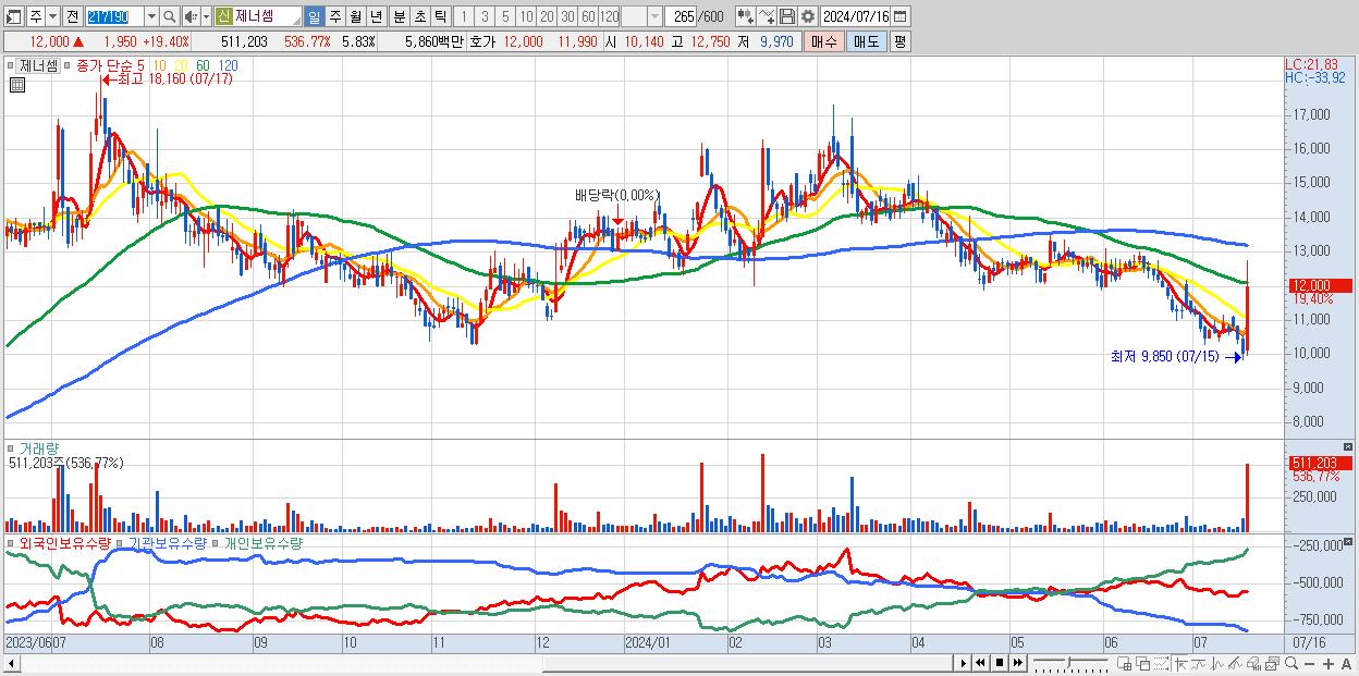 - 제너셈 (12,000원 ▲ 19.4% , 시총: 1,052억, 거래량: 511,203, 거래대금:59억)