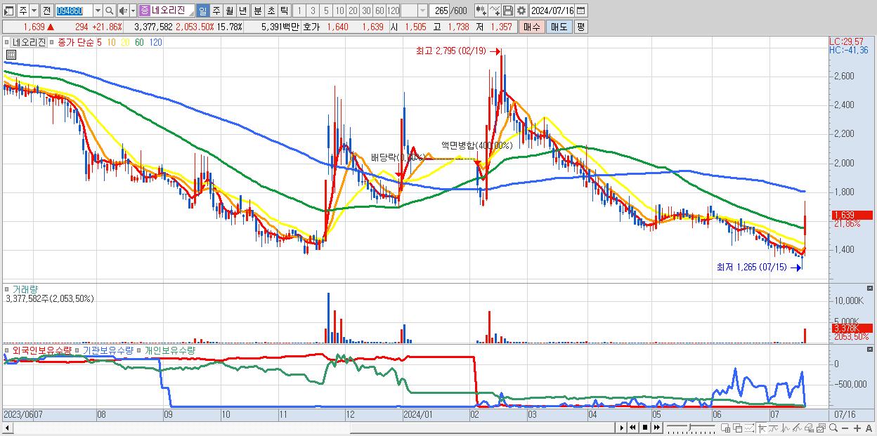 - 네오리진 (1,639원 ▲ 21.86% , 시총: 351억, 거래량: 3,377,582, 거래대금:54억)