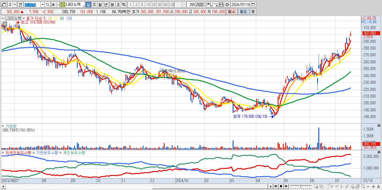 - LG이노텍 (302,000원 ▲ 2.55% , 시총: 71,475억, 거래량: 280,739, 거래대금:848억, KOSPI)