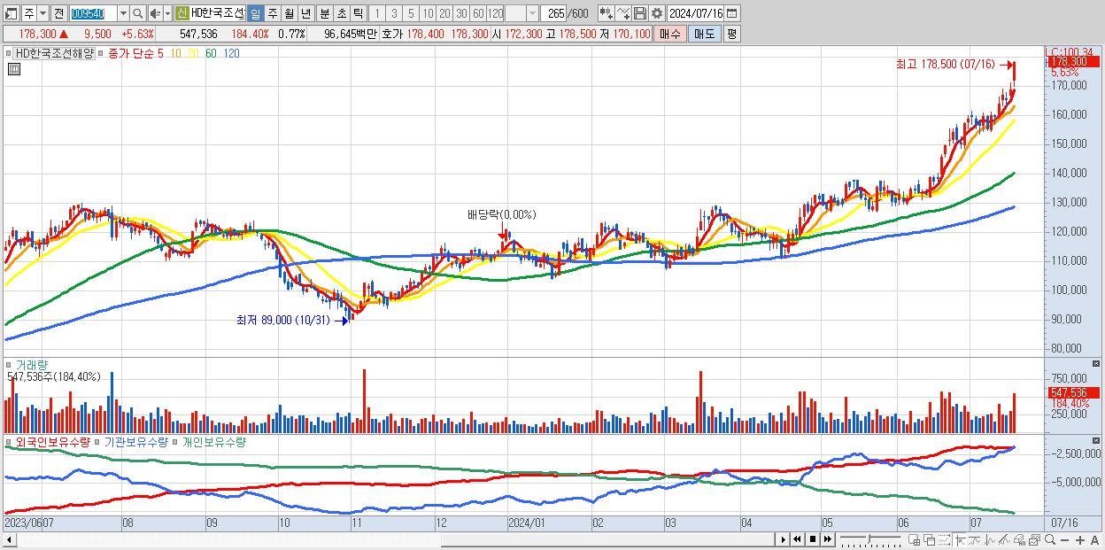 - HD한국조선해양 (178,300원 ▲ 5.63% , 시총: 126,188억, 거래량: 547,536, 거래대금:966억, KOSPI)
