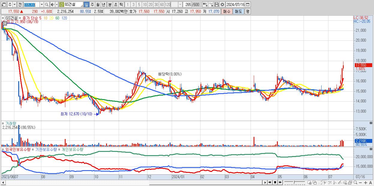 - GS건설 (17,550원 ▲ 1.68% , 시총: 15,020억, 거래량: 2,216,254, 거래대금:391억, KOSPI)