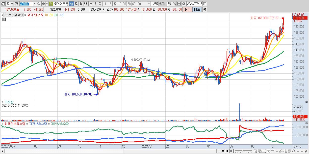 - HD현대중공업 (167,500원 ▲ 4.69% , 시총: 148,695억, 거래량: 322,640, 거래대금:534억, KOSPI)
