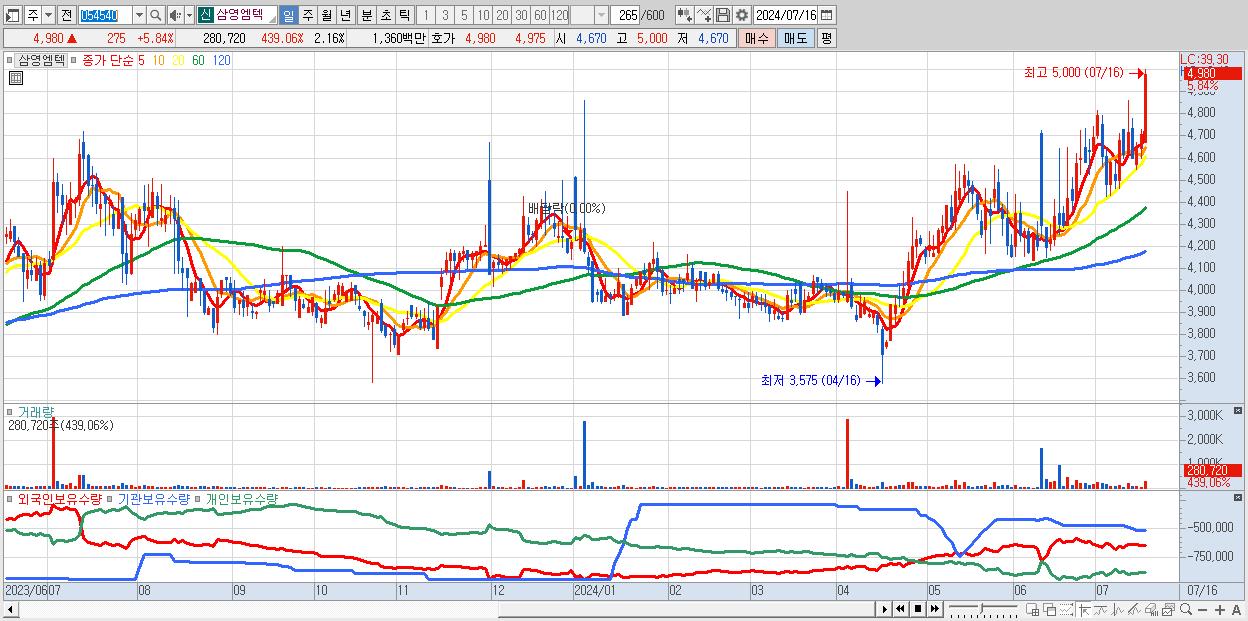 - 삼영엠텍 (4,980원 ▲ 5.84% , 시총: 647억, 거래량: 280,720, 거래대금:14억, KOSDAQ)
