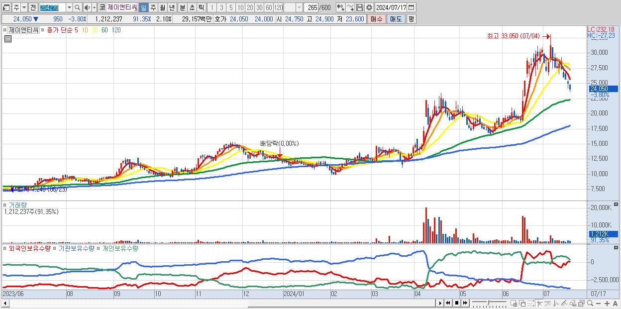 - 제이앤티씨 (24,050원 ▼ -3.8% , 시총: 13,913억, 외국인 순매수 거래금:61억)