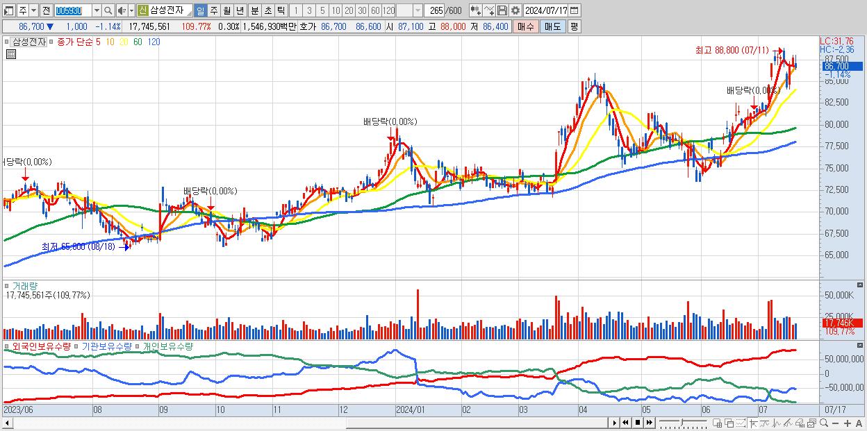 - 삼성전자 (86,700원 ▼ -1.14% , 시총: 5,175,801억, 외국인 순매수 거래금:347억)