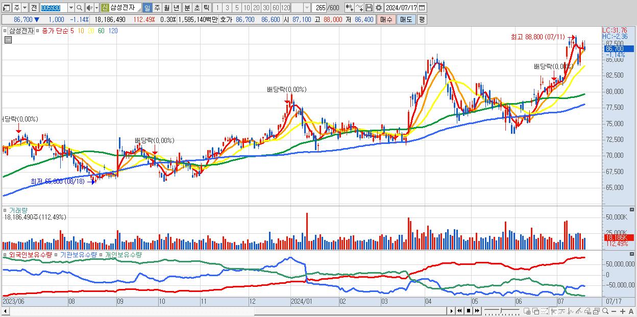 - 삼성전자 (86,700원 ▼ -1.14% , 시총: 5,175,801억, 거래량: 18,186,490, 거래대금:15,851억)