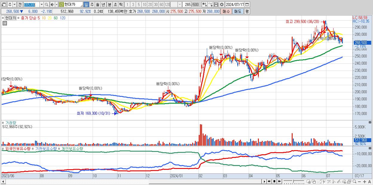 - 현대차 (268,500원 ▼ -2.19% , 시총: 562,282억, 거래량: 512,968, 거래대금:1,385억)
