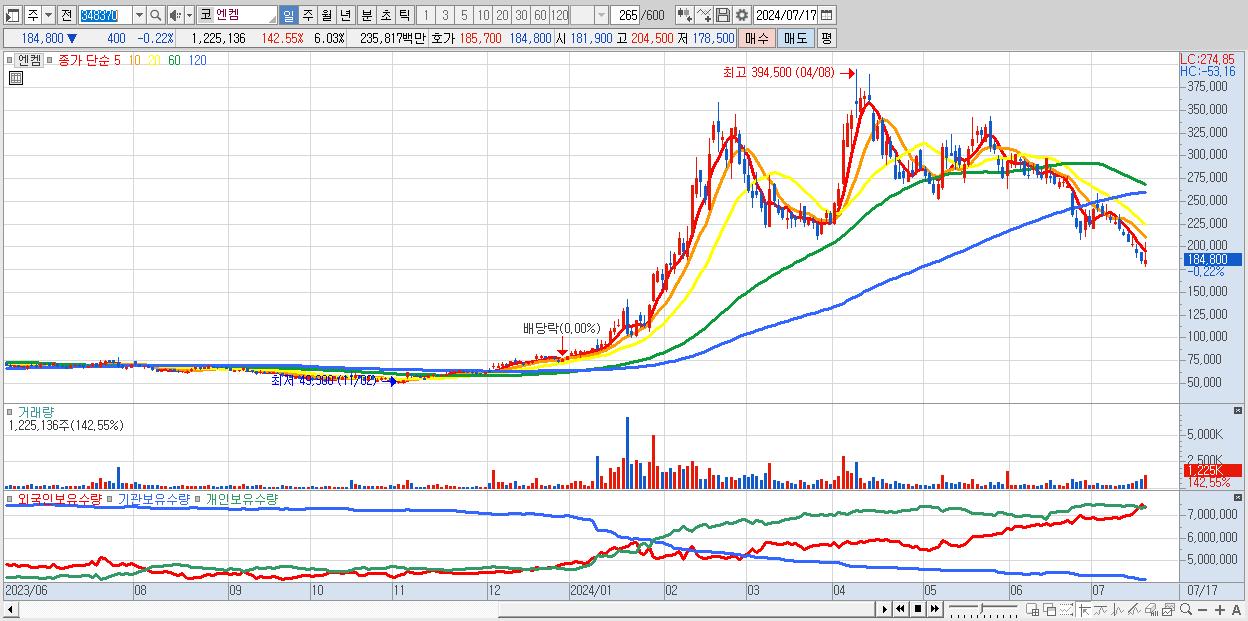 - 엔켐 (184,800원 ▼ -0.22% , 시총: 37,571억, 거래량: 1,225,136, 거래대금:2,358억)