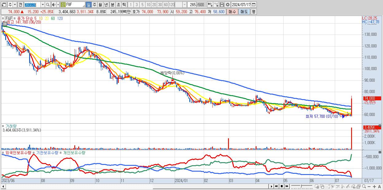 - F&F (74,000원 ▲ 25.85% , 시총: 28,347억, 거래량: 3,404,663, 거래대금:2,452억)