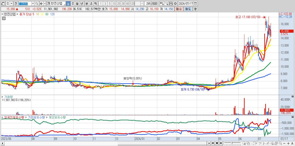 - 한전산업 (15,000원 ▲ 3.52% , 시총: 4,890억, 거래량: 11,901,982, 거래대금:1,825억)