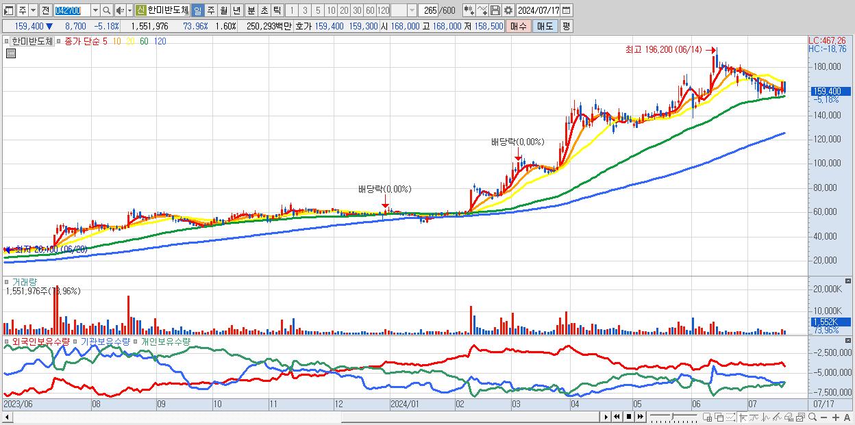 - 한미반도체 (159,400원 ▼ -5.18% , 시총: 154,608억, 거래량: 1,551,976, 거래대금:2,503억)