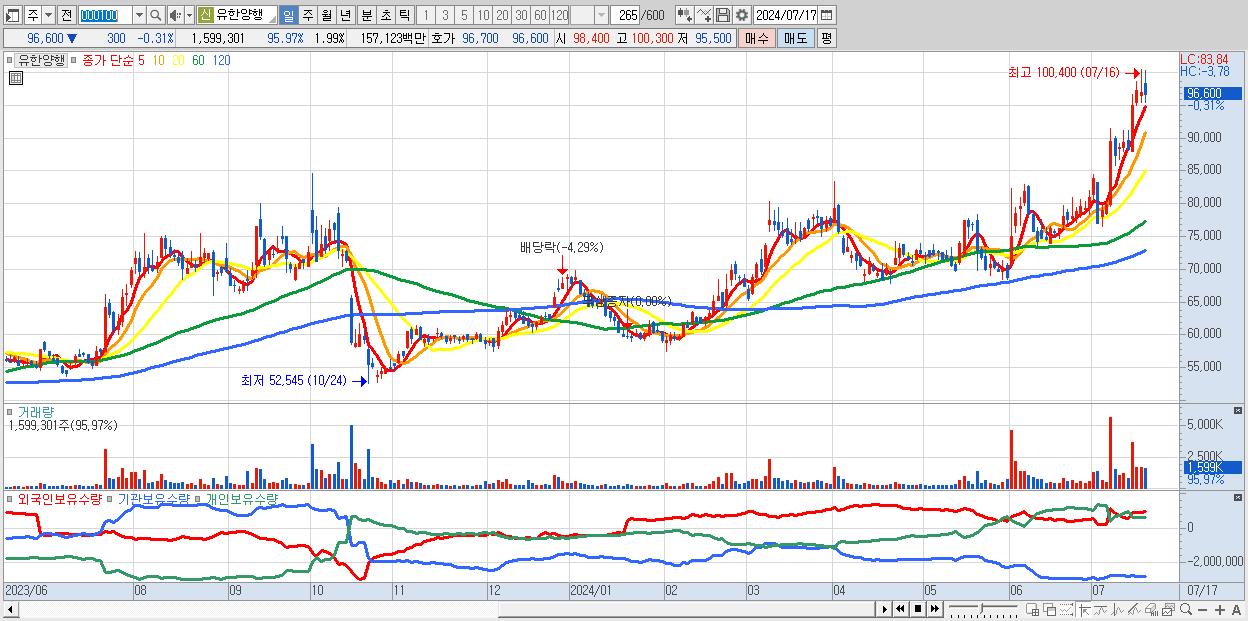 - 유한양행 (96,600원 ▼ -0.31% , 시총: 77,482억, 거래량: 1,599,301, 거래대금:1,571억)