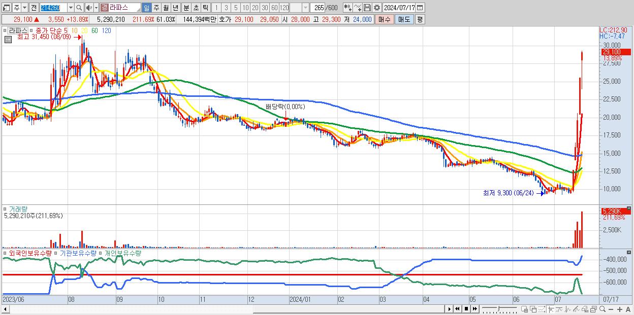 - 라파스 (29,100원 ▲ 13.89% , 시총: 2,522억, 거래량: 5,290,210, 거래대금:1,444억)