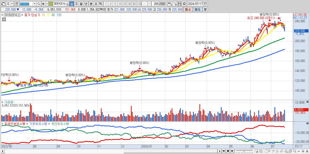 - SK하이닉스 (220,500원 ▼ -5.36% , 시총: 1,605,245억, 거래량: 6,051,510, 거래대금:13,548억)