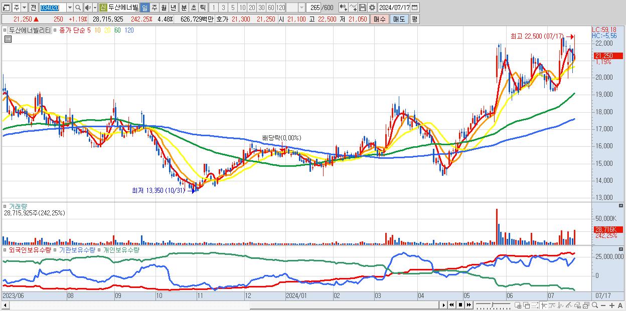 - 두산에너빌리티 (21,250원 ▲ 1.19% , 시총: 136,119억, 거래량: 28,715,925, 거래대금:6,267억)