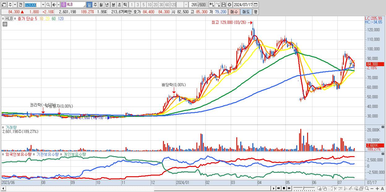 - HLB (84,300원 ▲ 2.18% , 시총: 110,303억, 거래량: 2,601,198, 거래대금:2,137억)
