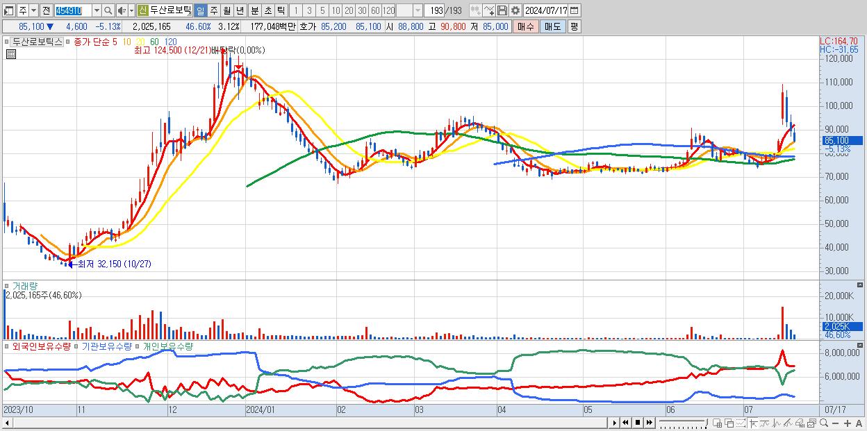 - 두산로보틱스 (85,100원 ▼ -5.13% , 시총: 55,162억, 거래량: 2,025,165, 거래대금:1,770억)