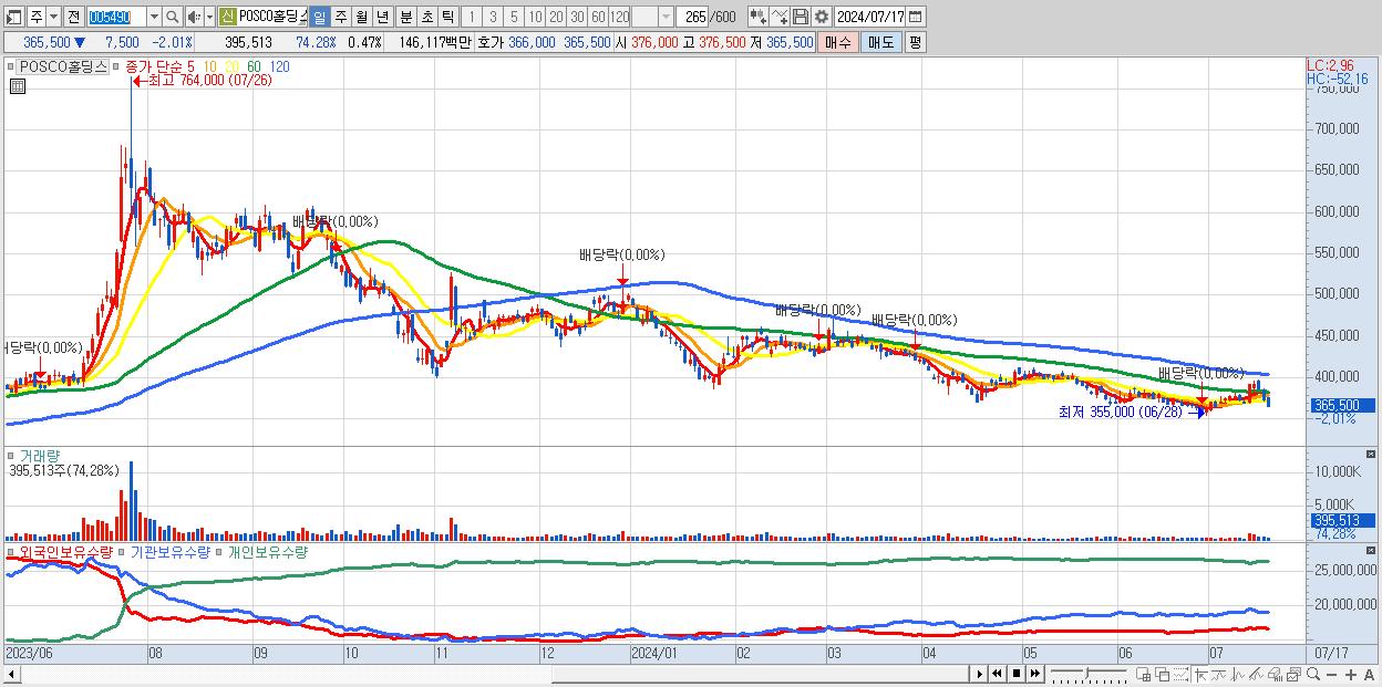 - POSCO홀딩스 (365,500원 ▼ -2.01% , 시총: 309,108억, 거래량: 395,513, 거래대금:1,461억)