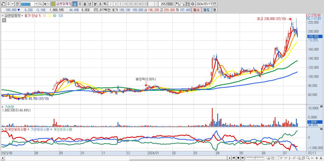 - 삼천당제약 (189,000원 ▼ -3.18% , 시총: 44,335억, 거래량: 1,888,595, 거래대금:3,728억)