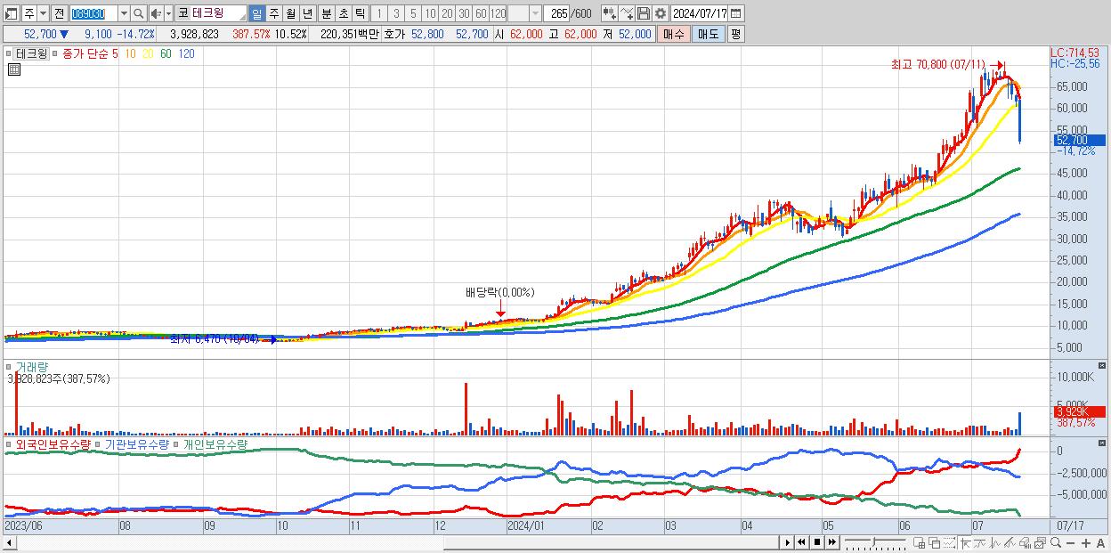 - 테크윙 (52,700원 ▼ -14.72% , 시총: 19,685억, 거래량: 3,928,823, 거래대금:2,204억)
