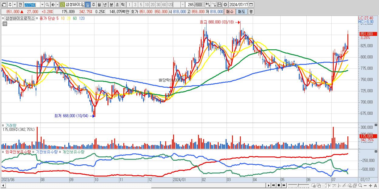 - 삼성바이오로직스 (851,000원 ▲ 3.28% , 시총: 605,691억, 거래량: 175,009, 거래대금:1,481억)