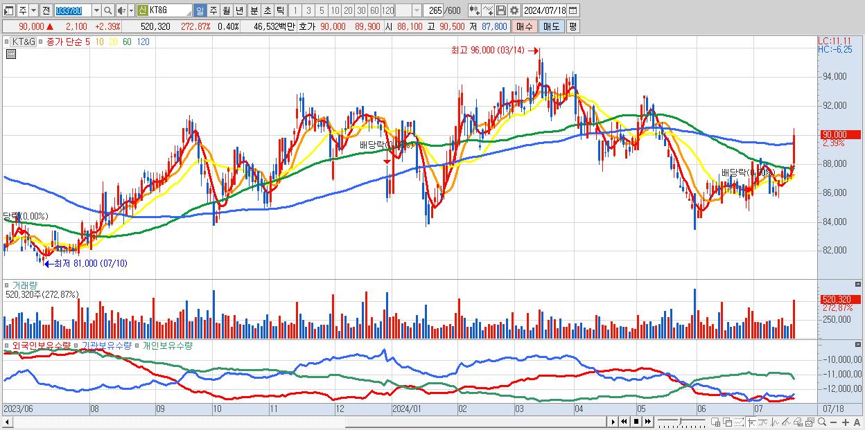 - KT&G (90,000원 ▲ 2.39% , 시총: 117,290억, 외국인 순매수 거래금:247억)