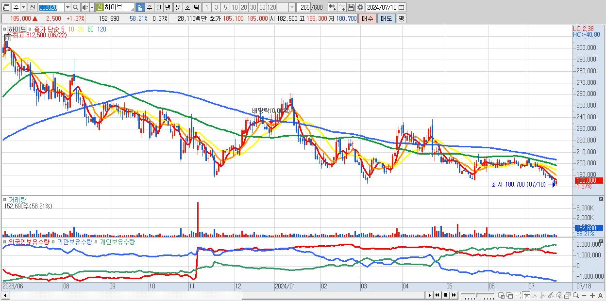- 하이브 (185,000원 ▲ 1.37% , 시총: 77,056억, 외국인 순매수 거래금:72억)