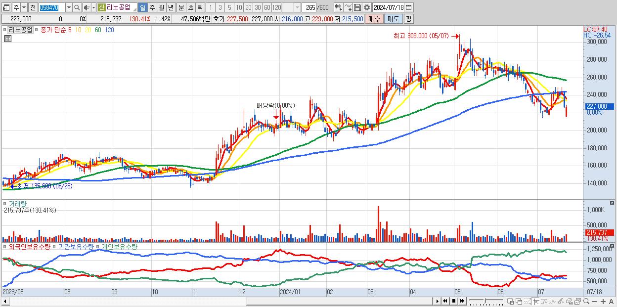 - 리노공업 (227,000원 0% , 시총: 34,600억, 외국인 순매수 거래금:68억)