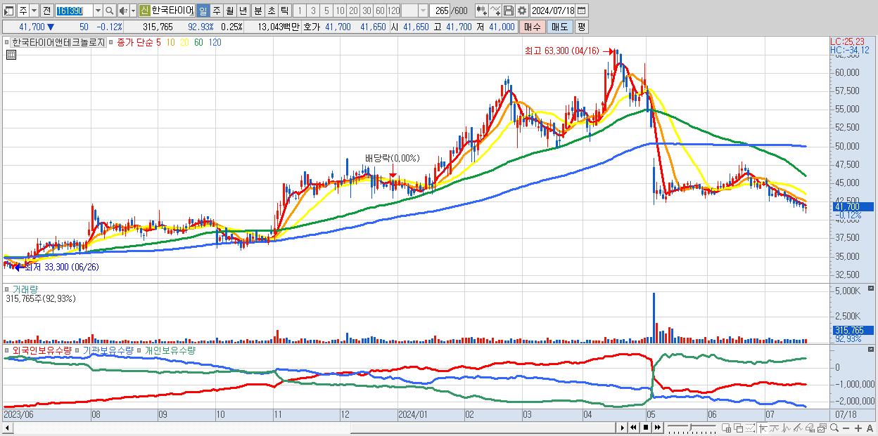 - 한국타이어앤테크놀로지 (41,700원 ▼ -0.12% , 시총: 51,656억, 외국인 순매수 거래금:44억)