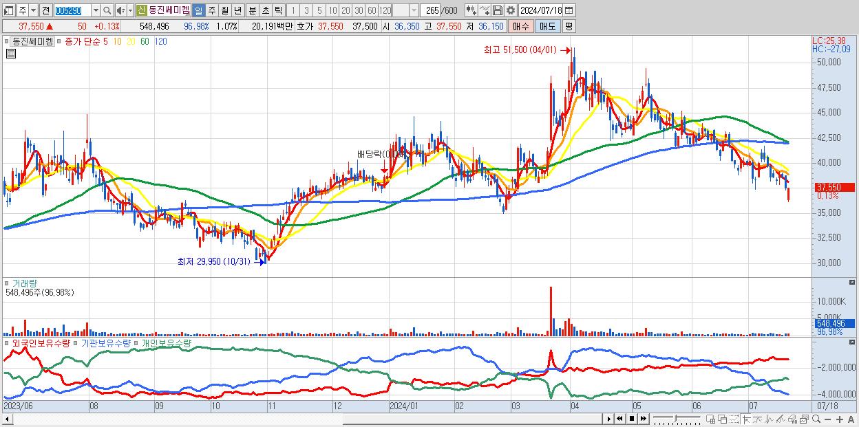 - 동진쎄미켐 (37,550원 ▲ 0.13% , 시총: 19,306억, 외국인 순매수 거래금:44억)
