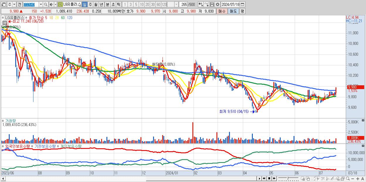 - LG유플러스 (9,980원 ▲ 1.53% , 시총: 43,574억, 외국인 순매수 거래금:53억)