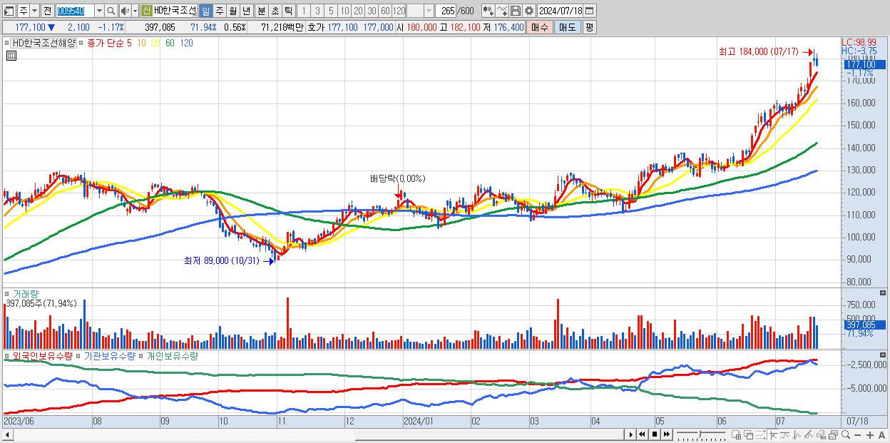 - HD한국조선해양 (177,100원 ▼ -1.17% , 시총: 125,339억, 외국인 순매수 거래금:46억)