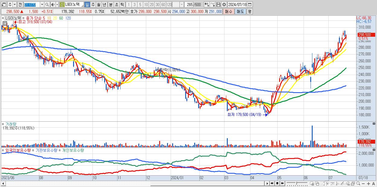 - LG이노텍 (298,500원 ▲ 0.51% , 시총: 70,646억, 외국인 순매수 거래금:176억)