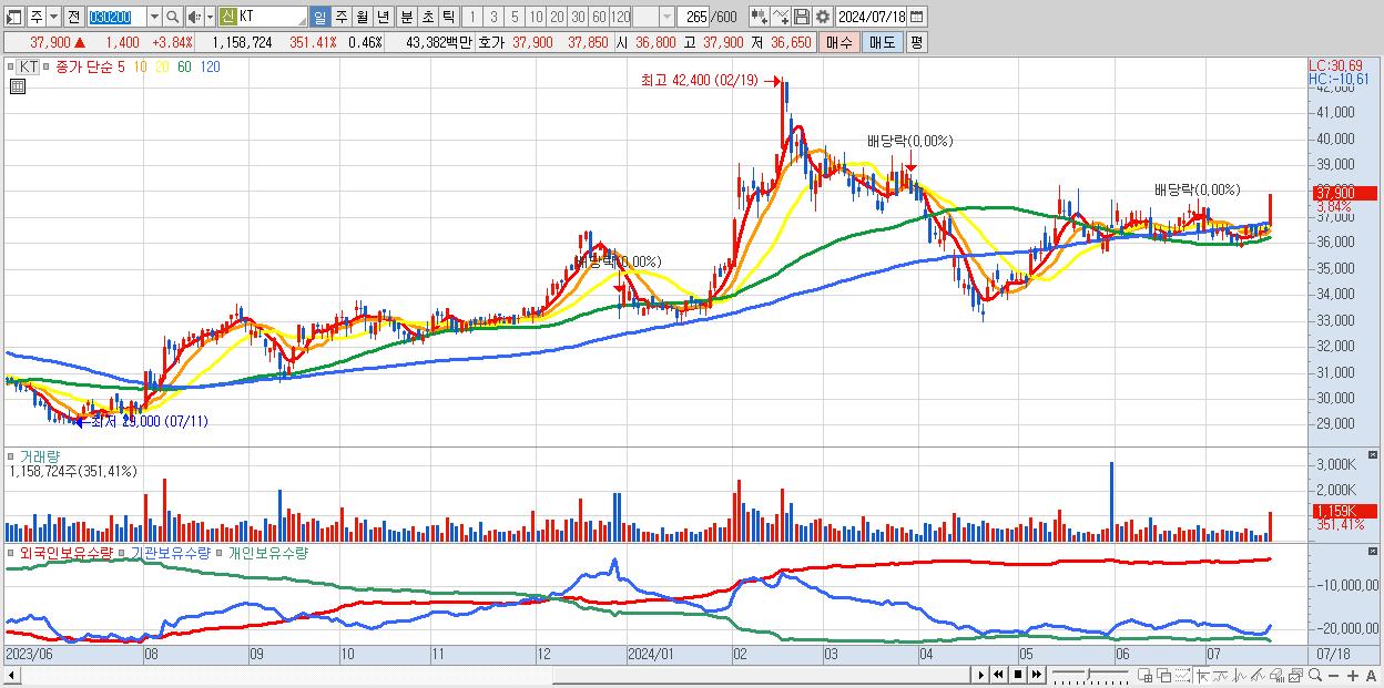 - KT (37,900원 ▲ 3.84% , 시총: 95,516억, 외국인 순매수 거래금:103억)